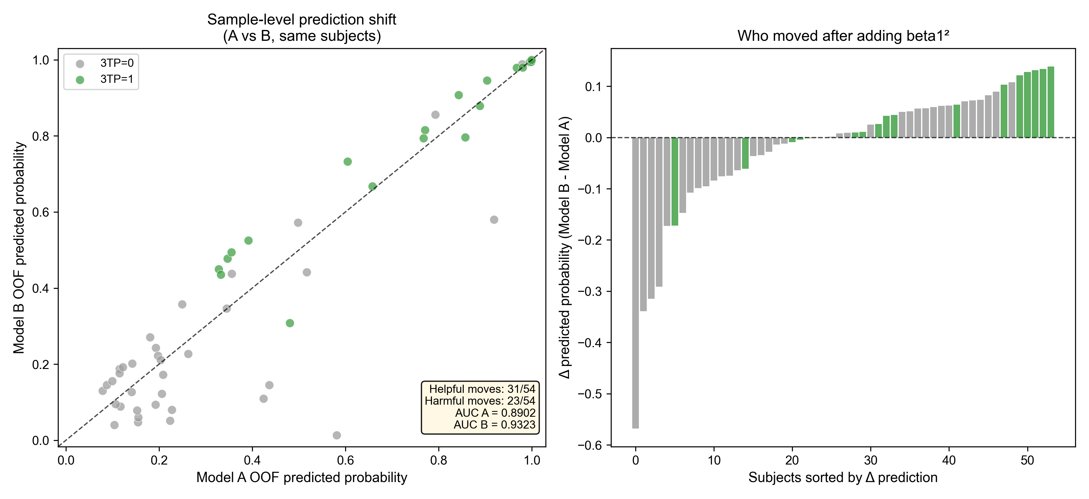 - 小於 0:加平方後分數變低(越像健康)