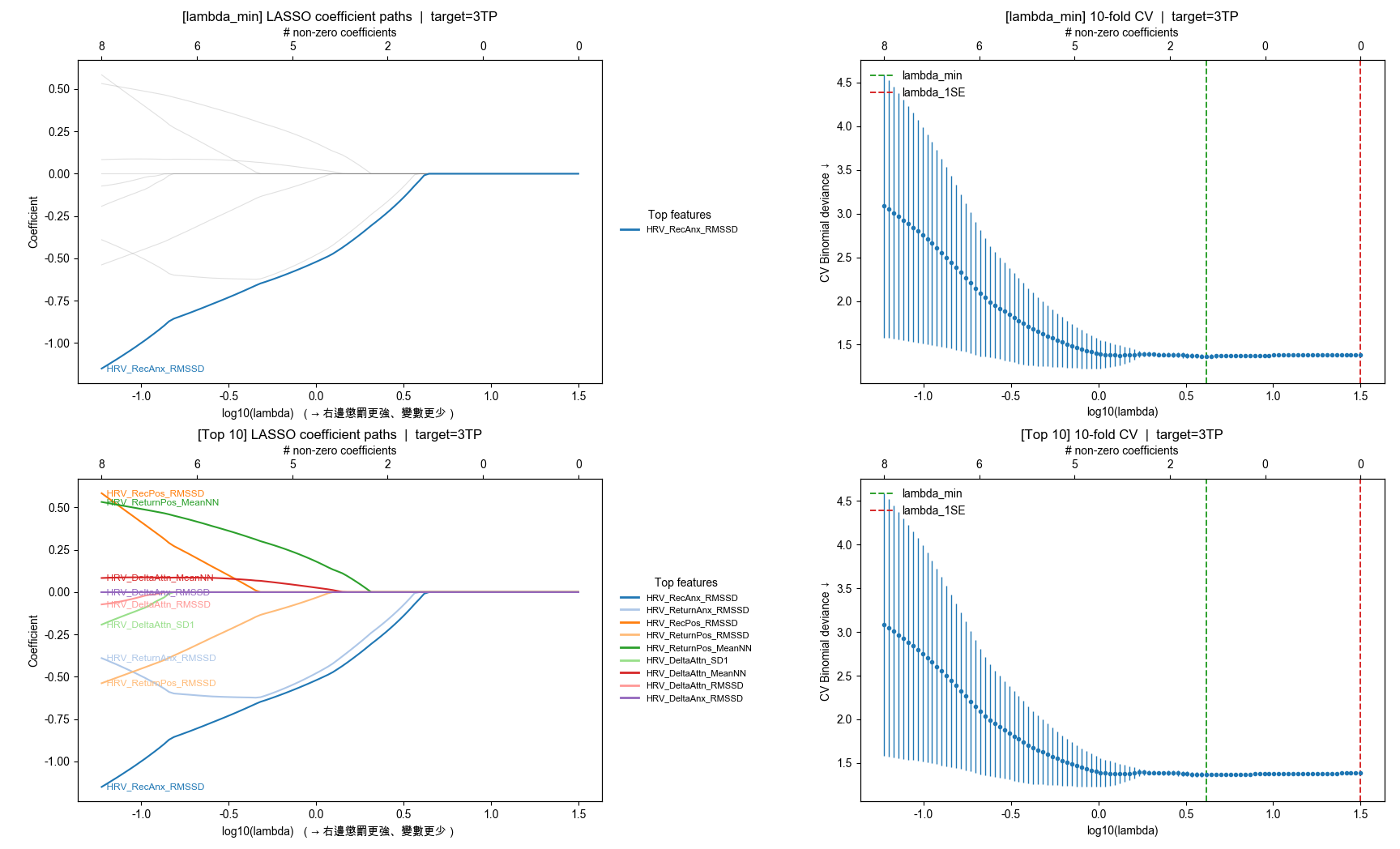 - LASSO 會給負係數 👉 數值越小 → 越偏向失眠組(正類)。