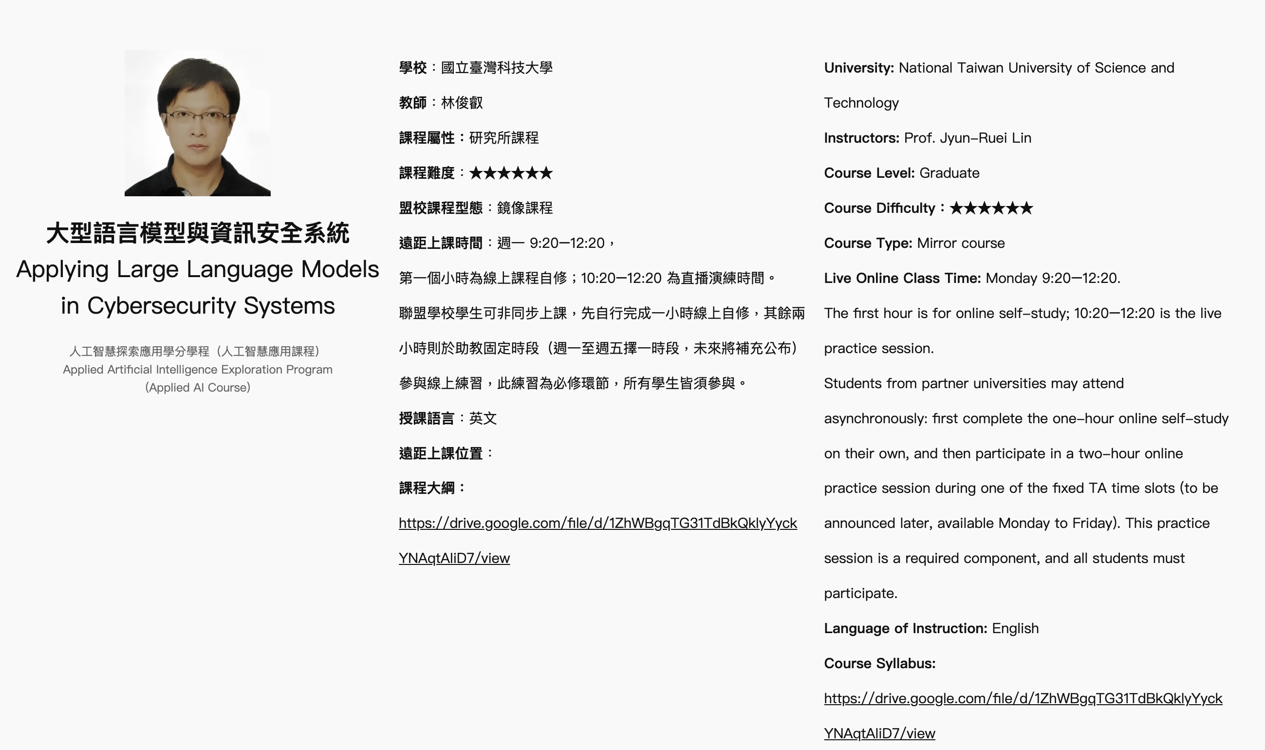 碩專班課程清單 目前已選 應用統計與軟體操作實務 預計在校時間: 週二下午~週四下午 是否需補強專業基礎?(大學部課程) 額外選修專業課程:人工智慧學院課程 👉 TAICA (臺灣大專院校人工智慧學程聯盟) 不確定碩專班能不能上(已報名) 有通知學長可以選修(對寫論文有幫助)